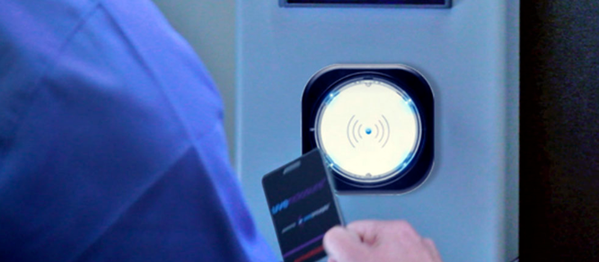使用(yòng)前,醫(yī)療工(gōng)作(zuò)者首先将諸如(rú)輪椅之類的(de)物(wù)品帶到(dào)UVE進行(xíng)消毒。他(tā)們先将與他(tā)們的(de)身(₩shēn)份相(xiàng)關聯的(de)HF RFID徽章(zhāng),輕靠閱讀(dú)器(qì)附近(jìn)。如(rú)果他(tā)們被授權使用(yòng)該 設備,設備将開(kāi)鎖并允許放(fàng)輪椅進去(qù)。